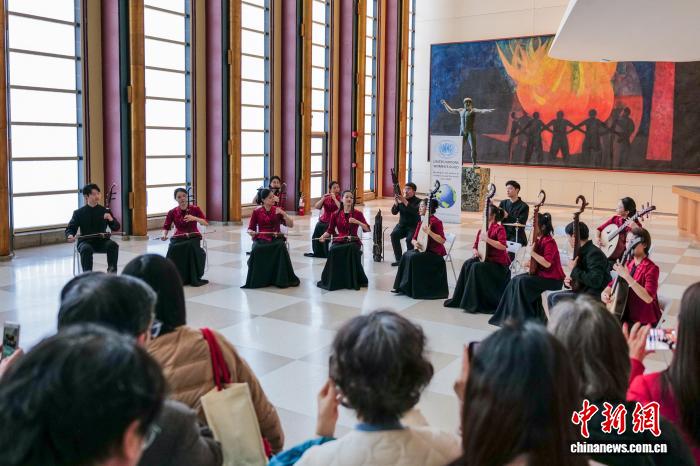 當?shù)貢r間2月25日,來自中央音樂學院的民樂演奏家在紐約聯(lián)合國總部上演快閃音樂會。圖為音樂會現(xiàn)場。 中新社記者 王帆 攝