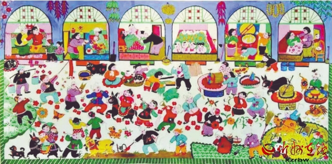 炕圍畫又稱“墻圍畫”,是一種中國(guó)民間常見的室內(nèi)裝飾畫。忻州處于高寒地帶,在農(nóng)村家家戶戶都用火炕取暖御寒,炕上的墻面極易脫落起皮,蹭臟衣物被褥。于是人們以刷墻所用的白土調(diào)以膠水,在環(huán)炕的墻上涂高約二尺的“圍子”,既保護(hù)了墻面,又使人們免遭臟衣污物之累。后來(lái),炕圍畫逐漸發(fā)展為以顏料做底、色彩畫花、桐油涂罩,既鮮艷明亮,又堅(jiān)固耐久。日常臟污了,用濕布擦拭,則又光亮如新。