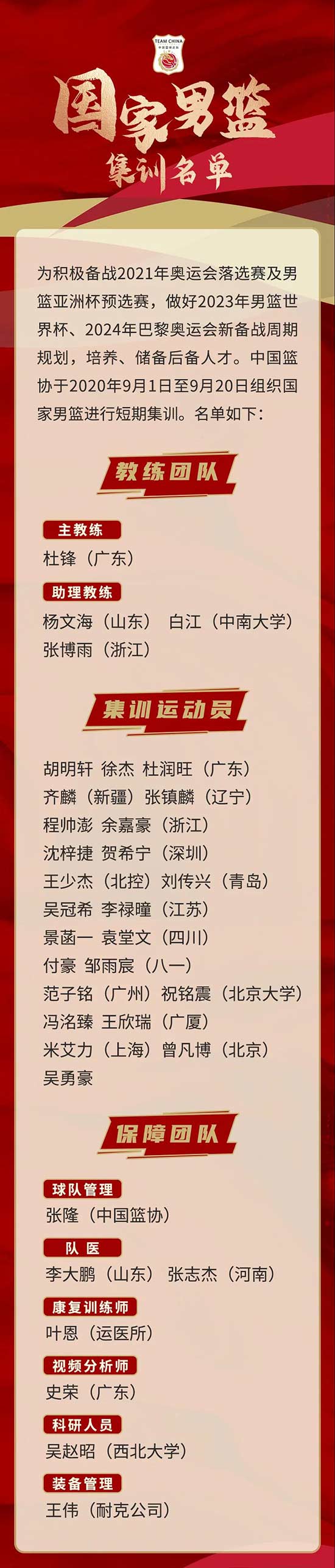 人民網(wǎng)北京8月26日電(郝帥)為積極備戰(zhàn)2021年奧運會落選賽及男籃亞洲杯預(yù)選賽,做好2023年男籃世界杯、2024年巴黎奧運會新備戰(zhàn)周期規(guī)劃,培養(yǎng)、儲備后備人才。中國籃協(xié)于2020年9月1日至9月20日組織國家男籃進(jìn)行短期集訓(xùn),名單今日出爐。