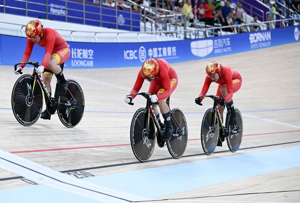26日傍晚舉行的女子團(tuán)體競速賽決賽中,一道紅色閃電劃破位于千島湖畔的自行車館,激起場內(nèi)一陣陣助威聲。鮑珊菊和隊(duì)友從一開始就占據(jù)領(lǐng)先位置,并最終以46秒376創(chuàng)造新的亞運(yùn)會紀(jì)錄,將金牌收入囊中。