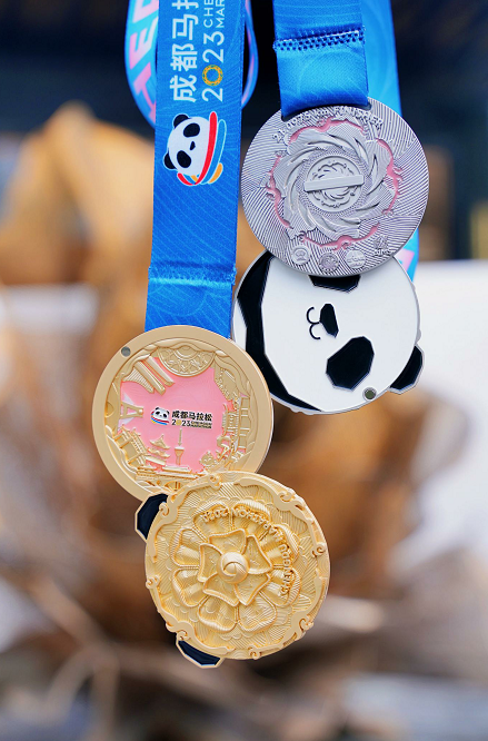 當(dāng)日發(fā)布會(huì)現(xiàn)場(chǎng),本次成都馬拉松完賽獎(jiǎng)牌正式亮相。遵循“精雕細(xì)琢,別具巧思”的設(shè)計(jì)宗旨,獎(jiǎng)牌將芙蓉花作為主體元素,加上經(jīng)典太陽神鳥的守護(hù),傳承與創(chuàng)新在獎(jiǎng)牌上得到了體現(xiàn)。獎(jiǎng)牌背面采用了感光變色材料,經(jīng)紫外線照射后會(huì)產(chǎn)生顏色變化,還原了“醉芙蓉”的色澤變化區(qū)間。