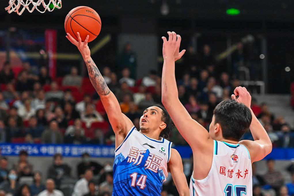 10月31日,新疆伊力特隊球員特萊斯(左)在比賽中上籃。新華社記者 丁磊 攝