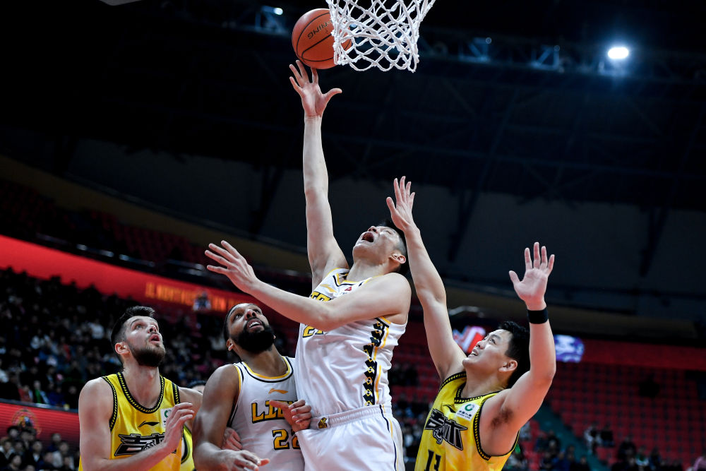 1月15日,廣廈隊(duì)胡金秋(右二)在比賽中上籃。新華社記者 許暢 攝