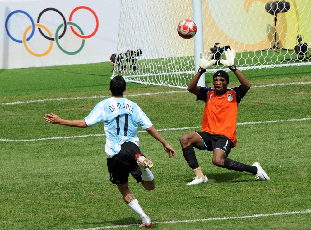 2008年8月23日,阿根廷隊球員迪馬利亞(左)破門得分。當日,北京奧運會男子足球決賽在國家體育場——“鳥巢”舉行,阿根廷隊迎戰(zhàn)尼日利亞隊。新華社記者 李鋼 攝