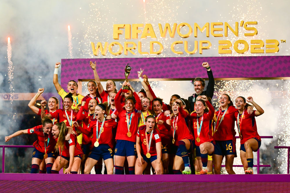 2023年8月20日,西班牙隊慶祝奪冠。當日,在澳大利亞悉尼舉行的2023年國際足聯(lián)女足世界杯決賽中,西班牙隊1:0戰(zhàn)勝英格蘭隊,獲得冠軍。新華社記者 朱煒 攝