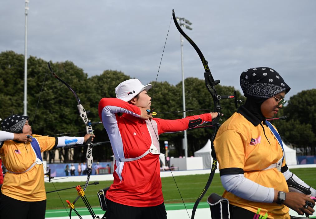 7月25日,巴黎奧運(yùn)會射箭女子個人排位賽在巴黎榮軍院舉行,中國選手楊曉蕾(中)在比賽中。新華社記者 賀燦鈴 攝