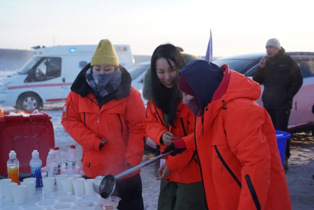 “加油!”“新年快樂!”參賽者、志愿者等互相加油鼓勁,在數(shù)九寒天中互送暖心祝福。