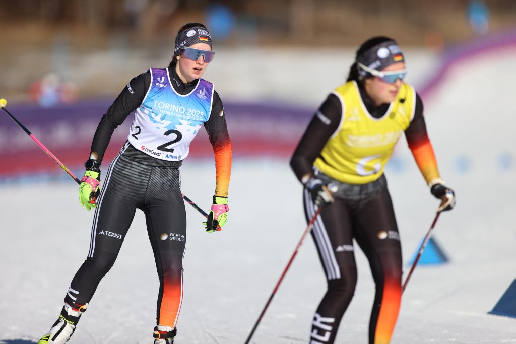 1月15日,德國選手約翰娜·雷克滕瓦爾德(左)和她的領(lǐng)滑員克里斯蒂安·克拉斯曼在2025年都靈大冬會越野滑雪女子10公里視障NS級比賽中。新華社記者 李京 攝