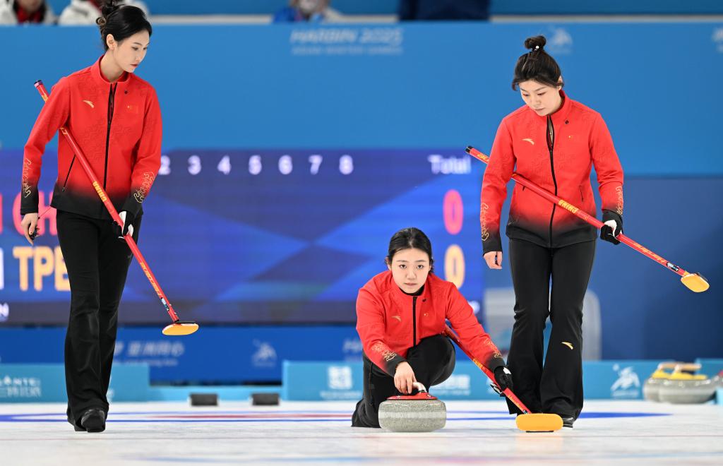 2月9日,中國隊選手韓雨(中)在比賽中擲壺。新華社記者 趙子碩 攝