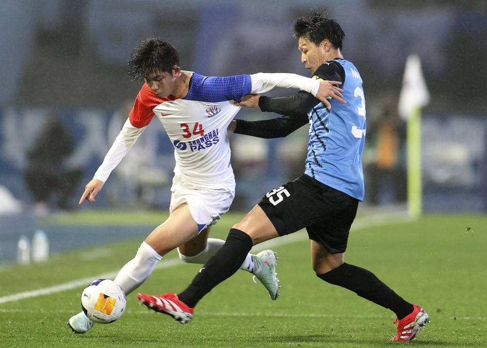 3月12日,上海申花隊球員劉誠宇(左)與川崎前鋒隊球員丸山祐市在比賽中拼搶。新華社記者 賈浩成 攝