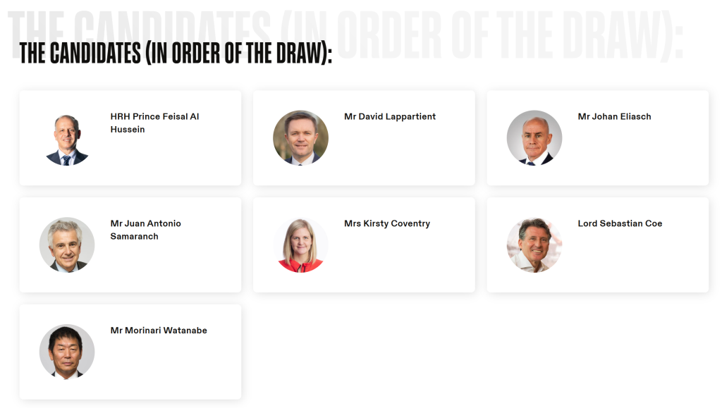 在國際奧委會近131年的歷史上,一共產(chǎn)生過九位主席,其中八人來自歐洲,另外一位來自美國。根據(jù)《奧林匹克憲章》,主席候選人必須是現(xiàn)任國際奧委會委員。本次參與競選的共有七人,其中歐洲四人,分別是國際奧委會副主席小薩馬蘭奇(65歲,西班牙)、世界田聯(lián)主席塞巴斯蒂安·科(68歲,英國)、國際自行車聯(lián)盟主席大衛(wèi)·拉帕爾蒂安(51歲,法國)和國際雪聯(lián)主席約翰·埃利亞施(63歲,瑞典和英國雙重國籍);亞洲兩人,分別是國際奧委會執(zhí)委費薩爾·侯賽因(61歲,約旦)和國際體操聯(lián)合會主席渡邊守成(66歲,日本);非洲一人,國際奧委會執(zhí)委、運動員委員會前主席柯絲蒂·考文垂(41歲,津巴布韋)。