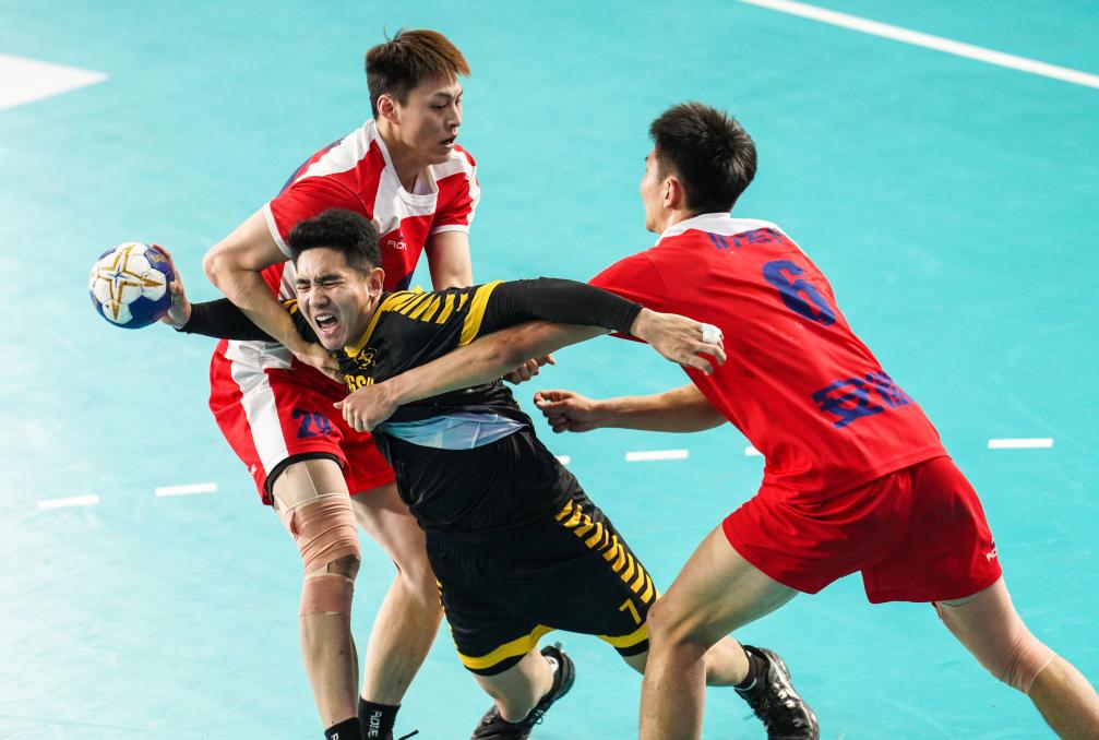 19日,中國男子手球超級聯(lián)賽遷安賽區(qū)江蘇隊(黑)與安徽隊(紅)在比賽中。