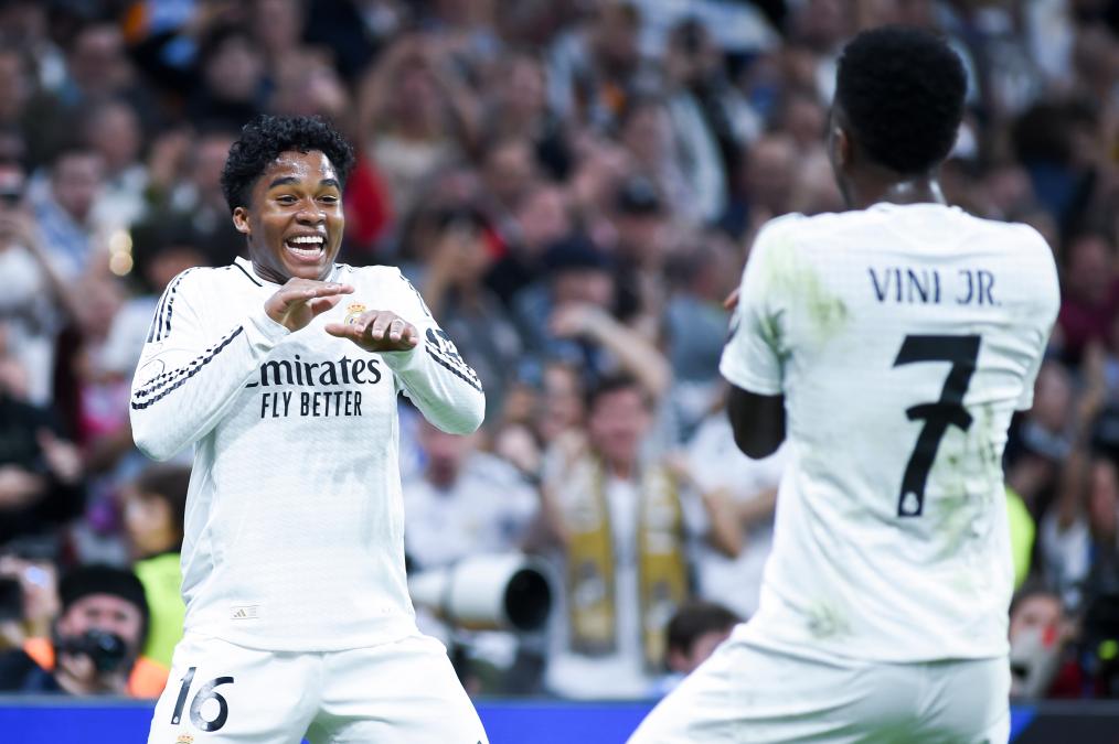4月1日,皇家馬德里隊(duì)球員恩德里克(左)和維尼修斯在比賽中慶祝進(jìn)球。新華社發(fā)(古斯塔沃·巴連特攝)
