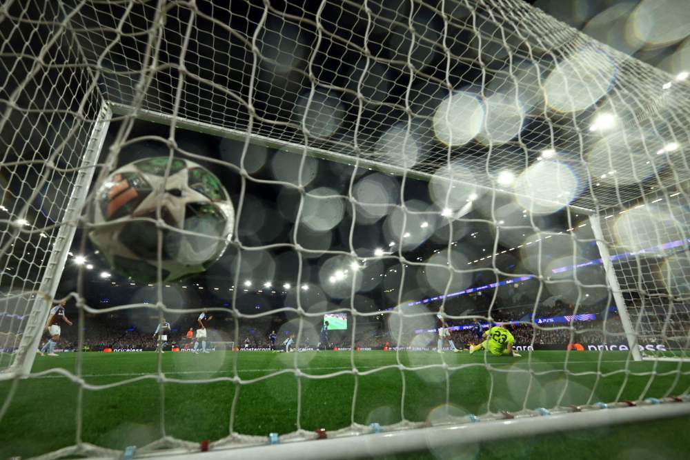 4月15日,維拉隊(duì)守門員馬丁內(nèi)斯(前)在比賽中未能撲出射門。新華社/法新