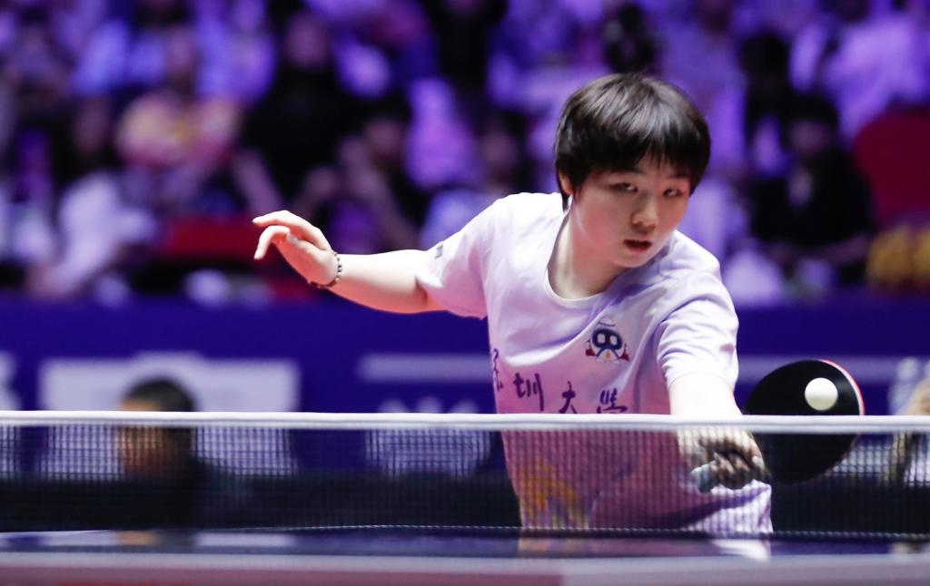 7月28日,深圳大學(xué)隊選手蒯曼在單打比賽中回球。新華社記者 劉瓊 攝