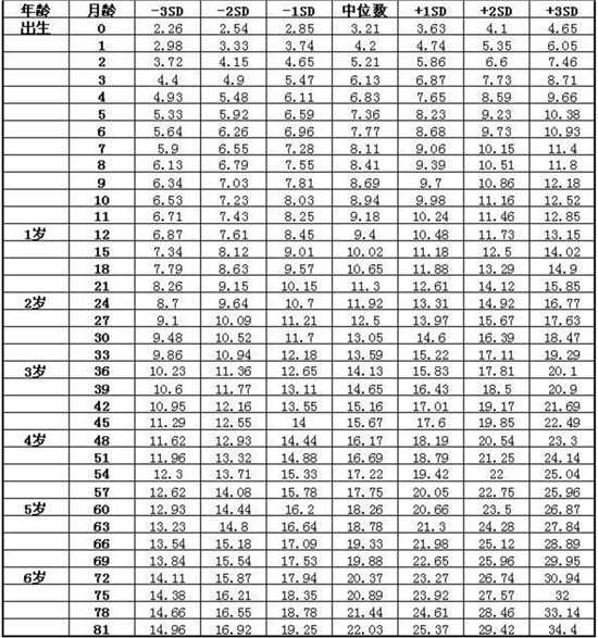 在兒童營養(yǎng)評價(jià)中,年齡別體重和體質(zhì)指數(shù)(BMI)是兩個(gè)重要的評價(jià)指標(biāo),常用于營養(yǎng)不良及超重、肥胖的篩查。以下表格為嬰幼兒體重對照表,家長們先自己查查孩子現(xiàn)在處在哪個(gè)位置,稍后帶領(lǐng)大家一起進(jìn)入胖瘦辯論局。