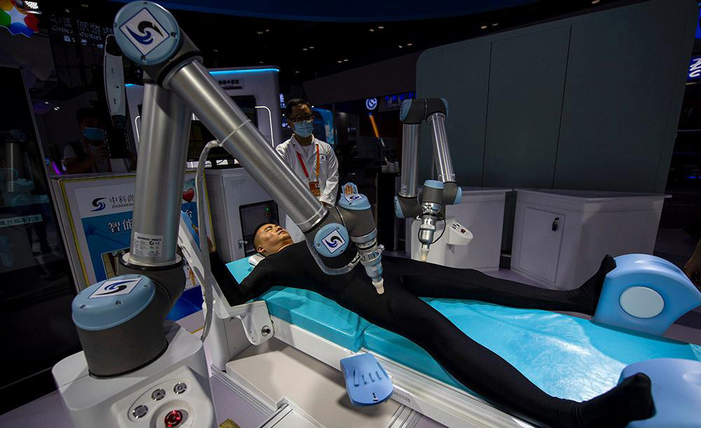 △2020年服貿(mào)會綜合展區(qū),參觀者正在體驗(yàn)中醫(yī)智能經(jīng)絡(luò)導(dǎo)引機(jī)器人。