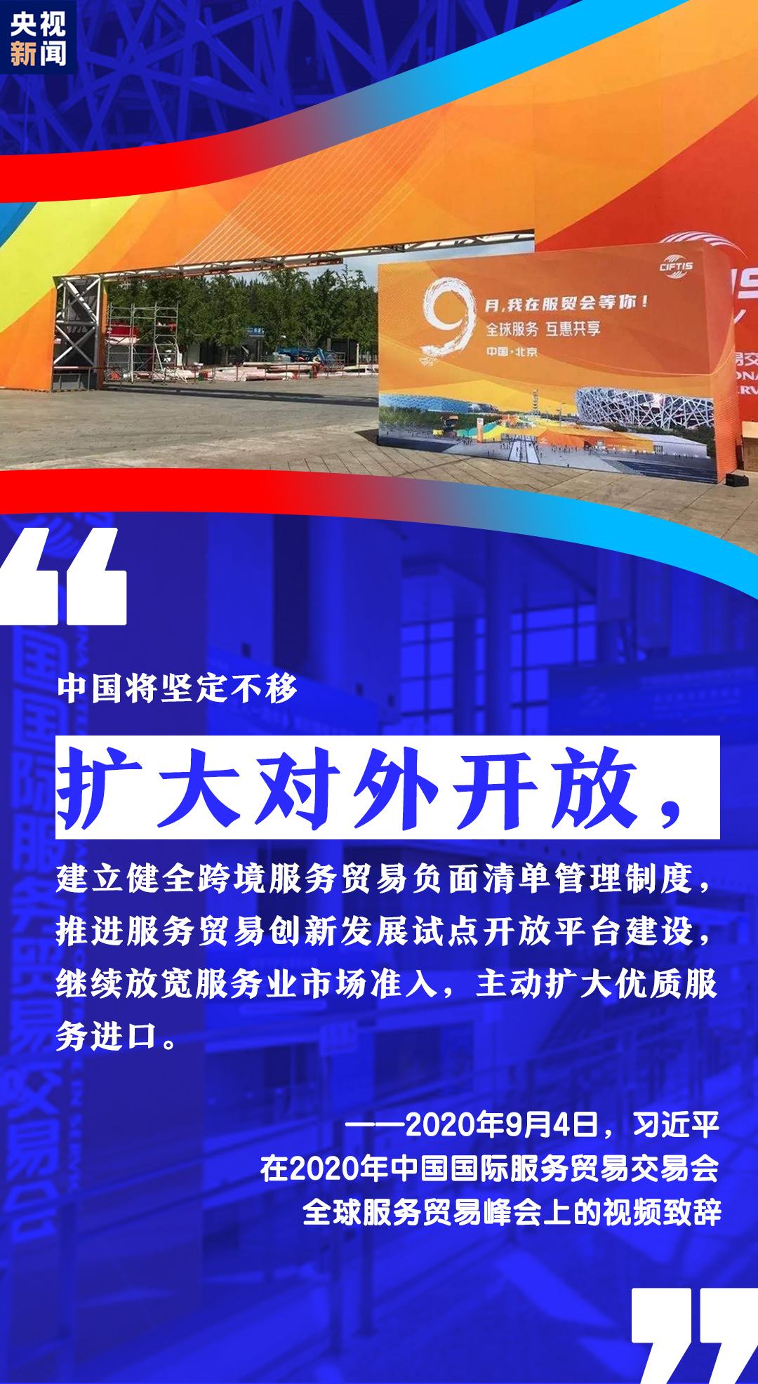 習(xí)近平表示,中國將堅(jiān)定不移擴(kuò)大對外開放,繼續(xù)放寬服務(wù)業(yè)市場準(zhǔn)入,發(fā)展服務(wù)貿(mào)易新業(yè)態(tài)新模式,支持組建全球服務(wù)貿(mào)易聯(lián)盟,支持北京打造國家服務(wù)業(yè)擴(kuò)大開放綜合示范區(qū),帶動形成更高層次改革開放新格局。