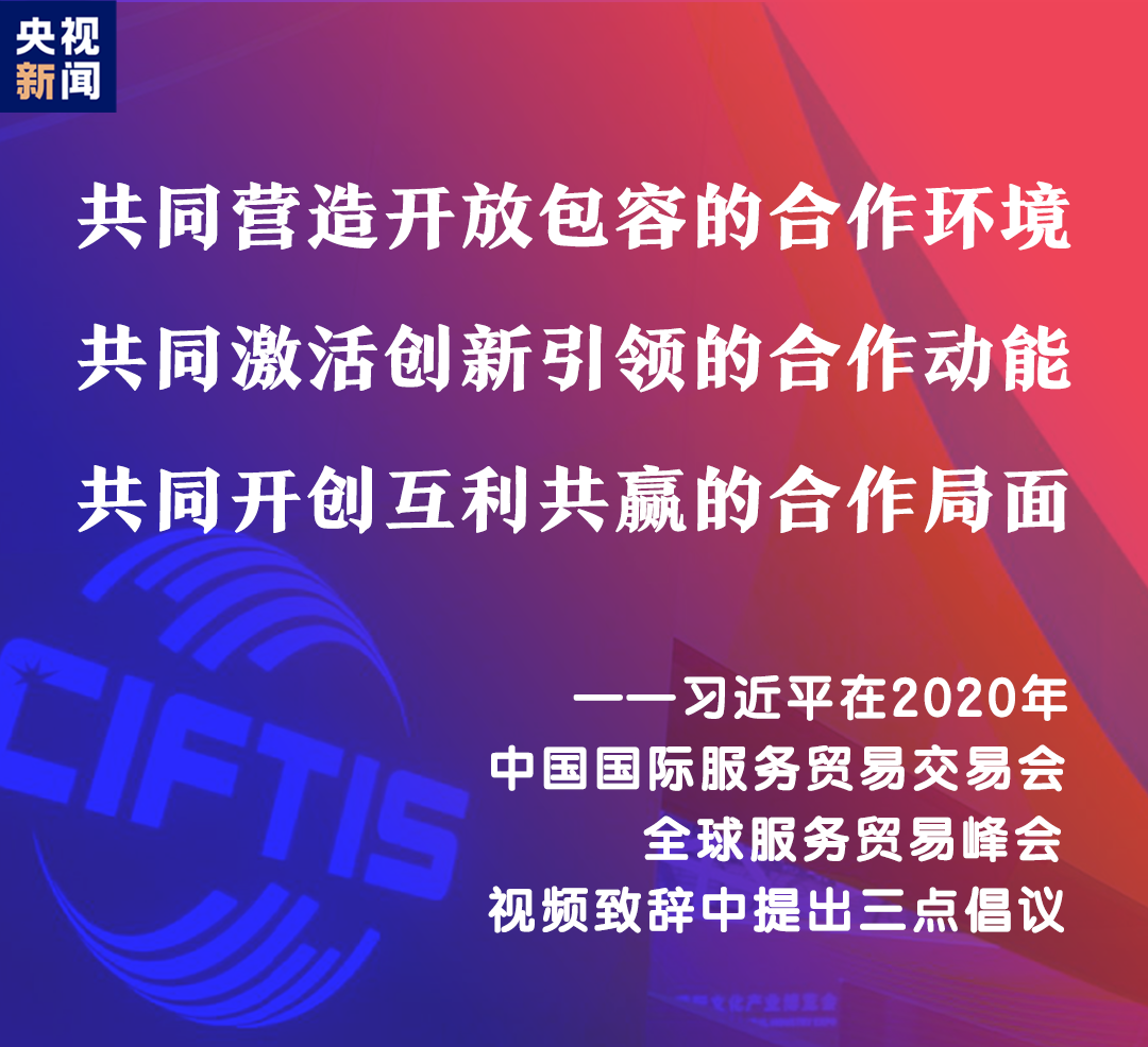 習(xí)近平表示,中國舉辦2020年中國國際服務(wù)貿(mào)易交易會,就是搭建起平臺和橋梁,讓各國人民充分展示服務(wù)貿(mào)易領(lǐng)域新發(fā)展新突破,共同享受人類社會發(fā)展進(jìn)步新技術(shù)新成果。