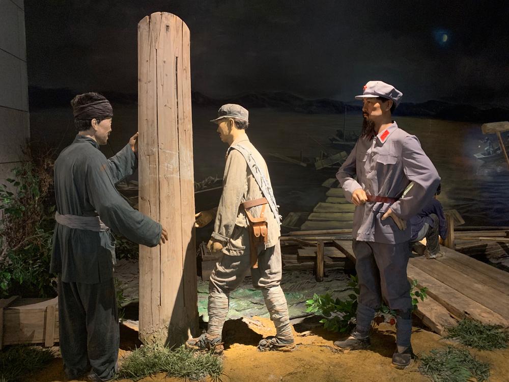 △中央紅軍出發(fā)紀(jì)念館再現(xiàn)于都老人將自己的棺木捐給紅軍搭浮橋的場景。(總臺央視記者郭晗光拍攝)
