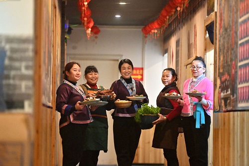 2025年2月28日,在廣西柳州市融水苗族自治縣融水鎮(zhèn)一家餐館,負責(zé)人吳葵花(中)和員工展示菜品。吳葵花經(jīng)營餐館22年,長期為當(dāng)?shù)剞r(nóng)村群眾提供穩(wěn)定就業(yè)崗位,并收購偏遠山區(qū)群眾種植的蔬菜。在廣西大山里,一批女能人活躍在農(nóng)村電商、民宿餐飲、鄉(xiāng)村文旅等各個領(lǐng)域,帶動留守婦女發(fā)展產(chǎn)業(yè),實現(xiàn)就近居家就業(yè)創(chuàng)業(yè)。新華社記者 黃孝邦 攝