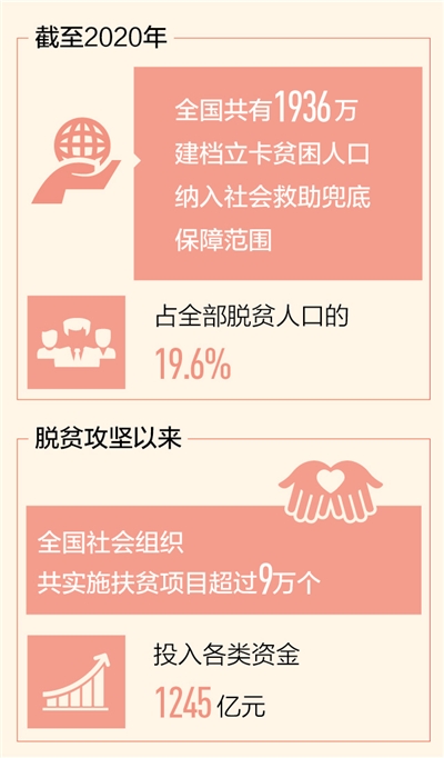 民政部門引導(dǎo)社會組織、慈善力量、專業(yè)社工、志愿者參與脫貧攻堅,使兜底保障既有力度,更有溫度。脫貧攻堅以來,全國社會組織共實施扶貧項目超過9萬個,投入各類資金1245億元,為決戰(zhàn)決勝脫貧攻堅作出了重要貢獻。