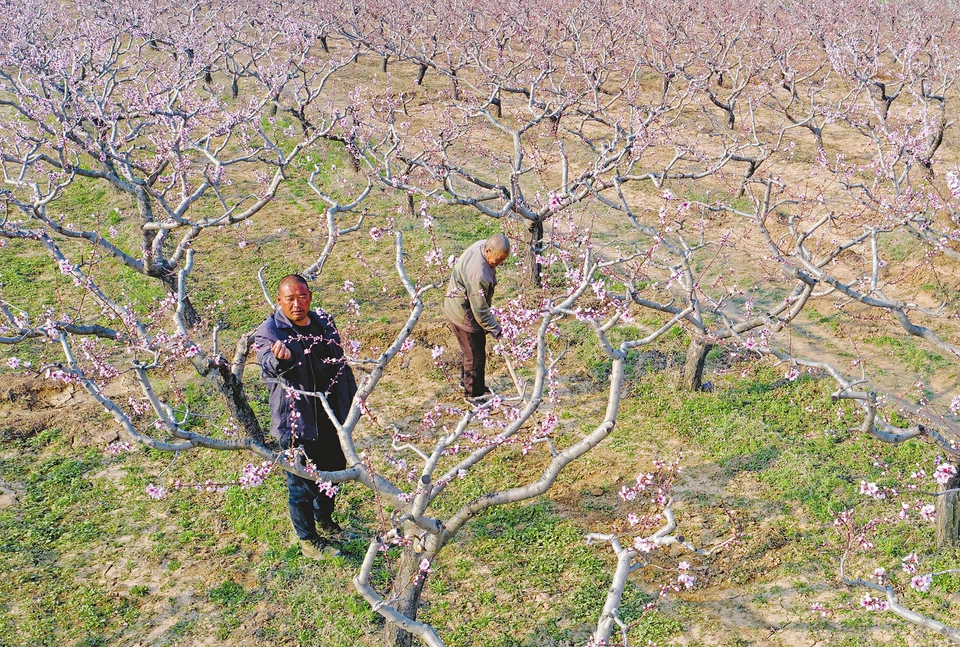3月30日,在臨汾市襄汾縣大鄧鄉(xiāng)上西梁村,果農(nóng)在桃園開展春管作業(yè)。日前,上西梁村上百畝桃樹進(jìn)入盛花期,當(dāng)?shù)剞r(nóng)民搶抓農(nóng)時(shí)對桃園開展追肥、灌溉、疏花等系列農(nóng)事活動,確保果樹正常生長、果實(shí)優(yōu)質(zhì)高產(chǎn)。李現(xiàn)俊攝