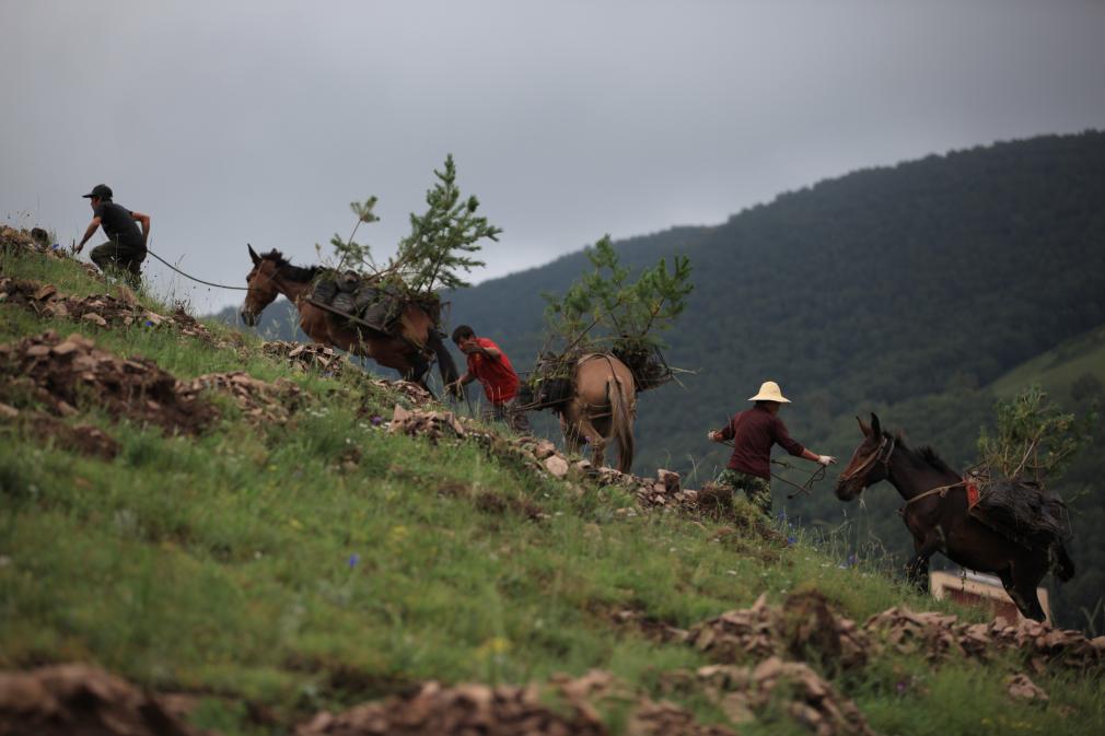 在承德豐寧滿(mǎn)族自治縣千松壩林場(chǎng),群眾將樹(shù)苗運(yùn)往山上。王立群 攝