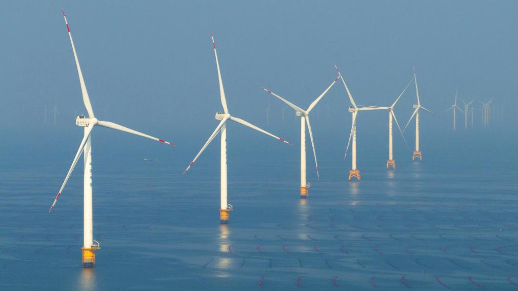 距離大連莊河市海岸線20多公里的黃海海域,300多座高約百米的“大風車”聳立在藍天碧海間,巨大的風電機組葉片不停轉(zhuǎn)動。莊河市發(fā)展和改革局副局長吳靜說:“目前,莊河已有4個海上風電項目并網(wǎng)運行,年發(fā)電量可達27.3億度。”