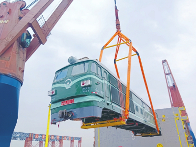 東風4B內(nèi)燃機車體作為中國鐵路第二代電傳動內(nèi)燃機車的代表車型,是中國鐵路史上產(chǎn)量最大、運用最廣泛、技術(shù)最成熟的內(nèi)燃機車車型之一。因車體單件長達22米、重達87噸,且沒有固定吊點、重心難尋,致使其吊裝不同于以往發(fā)運貨類,吊裝過程極易出現(xiàn)傾斜等情況,吊裝難度系數(shù)極高,需兩臺船吊采用“兜吊”的軟吊方式進行作業(yè),這對作業(yè)司機的操作提出了極高的要求,必須做到“三個同步”:兩臺船吊起吊高度同步、起升速度同步、轉(zhuǎn)向頻率同步。