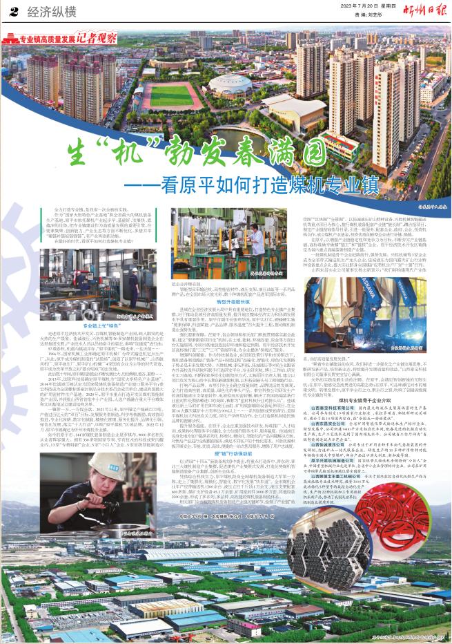 一鎮(zhèn)帶一方,一方促全盤。原平市把煤機專業(yè)鎮(zhèn)建設(shè)作為發(fā)展制造業(yè)、壯大縣域經(jīng)濟、推進產(chǎn)城融合的重要載體,立足產(chǎn)業(yè)基礎(chǔ)、發(fā)揮比較優(yōu)勢,以骨干企業(yè)為引領(lǐng),在關(guān)鍵技術(shù)上創(chuàng)新突破,持續(xù)提升服務(wù)水平,全力做強特色產(chǎn)業(yè)、做精拳頭產(chǎn)品,打造更多有生命力、有影響力、有競爭力的山西特色專業(yè)鎮(zhèn)品牌。