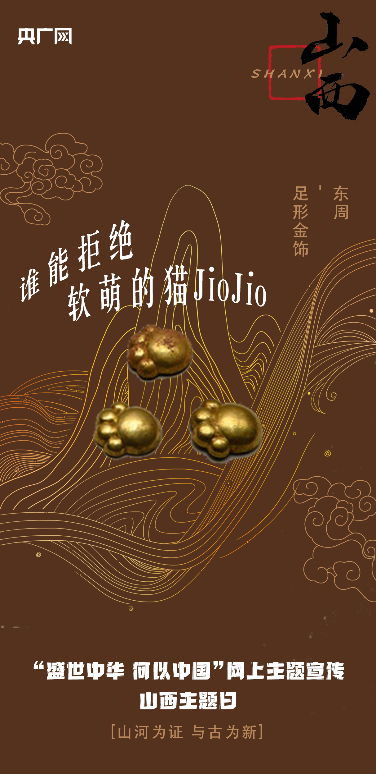 東周足形金飾。這組“貓爪”金飾文物出土于山西運(yùn)城垣曲北白鵝墓地,距今已有2700多年的歷史,一共五件,或?yàn)榕宕髟谘g的飾物。該金飾大小和小拇指指甲蓋相當(dāng),四個(gè)“腳趾”和一個(gè)“肉墊”的造型簡直就是貓爪復(fù)刻。