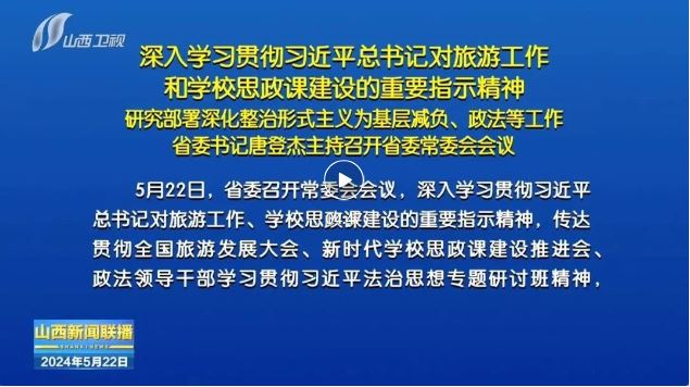 山西日報報道 5月22日,省委召開常委會會議,深入學習貫徹習近平總書記對旅游工作、學校思政課建設的重要指示精神,傳達貫徹全國旅游發(fā)展大會、新時代學校思政課建設推進會、政法領(lǐng)導干部學習貫徹習近平法治思想專題研討班精神,研究部署深化整治形式主義為基層減負工作。省委書記唐登杰主持會議。