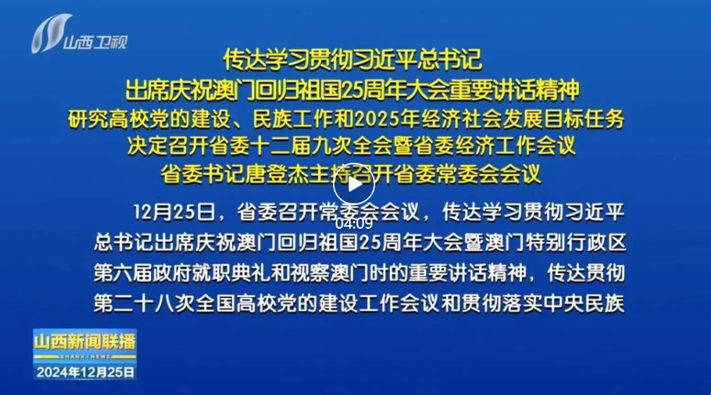 山西日?qǐng)?bào)報(bào)道 12月25日,省委召開常委會(huì)會(huì)議,傳達(dá)學(xué)習(xí)貫徹習(xí)近平總書記出席慶祝澳門回歸祖國(guó)25周年大會(huì)暨澳門特別行政區(qū)第六屆政府就職典禮和視察澳門時(shí)的重要講話精神,傳達(dá)貫徹第二十八次全國(guó)高校黨的建設(shè)工作會(huì)議和貫徹落實(shí)中央民族工作會(huì)議精神經(jīng)驗(yàn)交流會(huì)精神,研究2025年經(jīng)濟(jì)社會(huì)發(fā)展主要指標(biāo)及財(cái)政收支計(jì)劃安排,決定于近日召開省委十二屆九次全會(huì)暨省委經(jīng)濟(jì)工作會(huì)議。省委書記唐登杰主持會(huì)議。