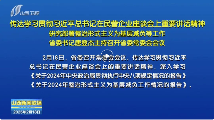 山西日報報道 2月18日,省委召開常委會會議,傳達(dá)學(xué)習(xí)貫徹習(xí)近平總書記在民營企業(yè)座談會上的重要講話精神,深入學(xué)習(xí)《關(guān)于2024年中央政治局貫徹執(zhí)行中央八項規(guī)定情況的報告》《關(guān)于2024年整治形式主義為基層減負(fù)工作情況的報告》,傳達(dá)貫徹中央層面整治形式主義為基層減負(fù)專項工作機(jī)制會議精神,審議通過《關(guān)于進(jìn)一步深化農(nóng)村改革扎實推進(jìn)鄉(xiāng)村全面振興的實施意見》《山西省人大常委會2025年立法計劃》《政協(xié)山西省委員會2025年度協(xié)商計劃》《政協(xié)山西省委員會2025年度重點民主監(jiān)督計劃》。省委書記唐登杰主持會議。