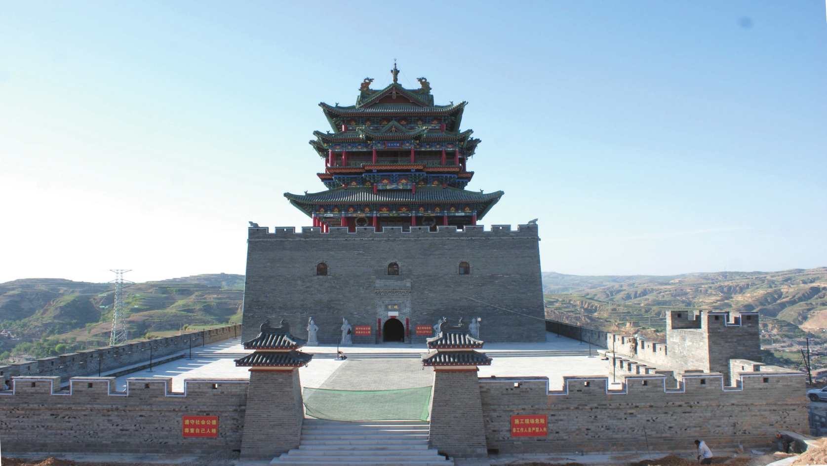 2011年至2012年,護(hù)城樓于原址復(fù)建為鋼筋混凝土仿古建筑。新建城堡南北長70米、東西寬36米,堡東開一拱門,外包磚,內(nèi)填素土并夯實,城墻上砌筑垛口。護(hù)城樓為方形,通高28.8米,其中墩臺高12米、寬28米;樓身高19米、寬20米。