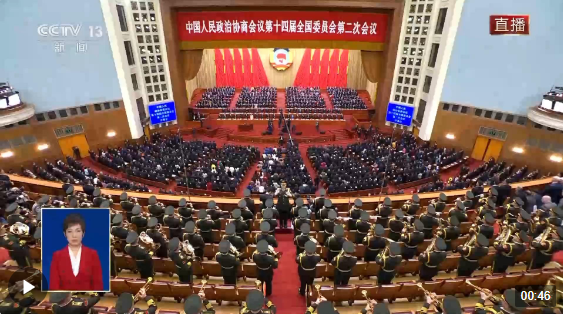 3月4日下午3時(shí),全國(guó)政協(xié)十四屆二次會(huì)議在人民大會(huì)堂開(kāi)幕,全體起立,高唱中華人民共和國(guó)國(guó)歌。