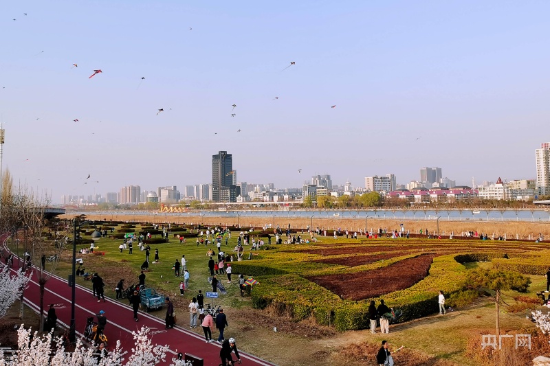 市民聚集在綠意盎然的汾河岸畔放風箏(央廣網(wǎng)記者 郎麒 攝)