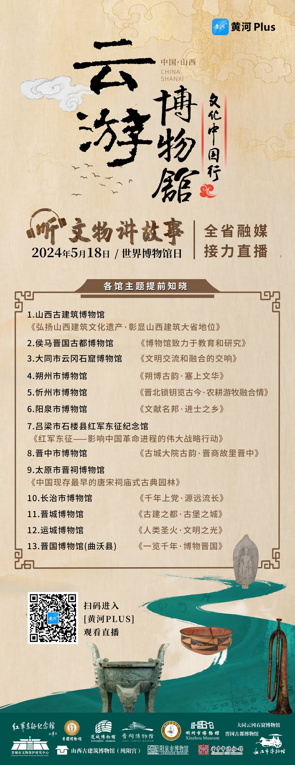 5月18日是世界博物館日,山西廣播電視臺視聽融媒體中心聯(lián)合全省11市廣電融媒體平臺,共同發(fā)起《云游博物館 聽文物講故事》全省融媒接力直播活動,邀請文物專家、學者、博物館工作人員,帶大家一起云游太原市晉祠博物館、運城博物館、大同市云岡石窟博物館、朔州市博物館、忻州市博物館、陽泉市博物館、晉中市博物館、長治市博物館、晉城博物館、侯馬晉國古都博物、晉國博物館(曲沃縣)、呂梁市石樓縣紅軍東征紀念館、山西古建筑博物館等13座特色博物館,圍繞13個博物館不同的主題,用線上直播的形式,講述藏品背后的文明密碼,助力公眾加深對博物館的了解,鑒賞山西豐富的館藏文物,感受中華文明中的山西貢獻。