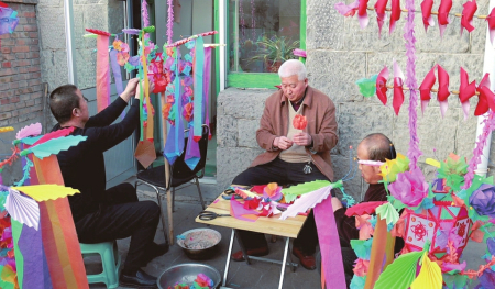 記者在現(xiàn)場看到,制作好的炮燈上有飄帶、繡球等裝飾,每盞炮燈不盡相同,畫有禾苗、動物等不同圖案,寓意五谷豐登、六畜興旺,“孔雀展翅”“雄羊抵頭”“駿馬奔馳”等主題的炮燈活靈活現(xiàn)?!霸谖业挠洃浝铮覀兇迥昴甓加兄谱魇止づ跓舻膫鹘y(tǒng),保存好的炮燈能用上兩年,燈架能代代相傳,我們有義務(wù)將這種技藝傳承發(fā)揚下去……”67歲的村民翟慶如是村里制作炮燈的“行家”,他現(xiàn)場拿起一張彩紙給記者折起了炮燈上的裝飾。