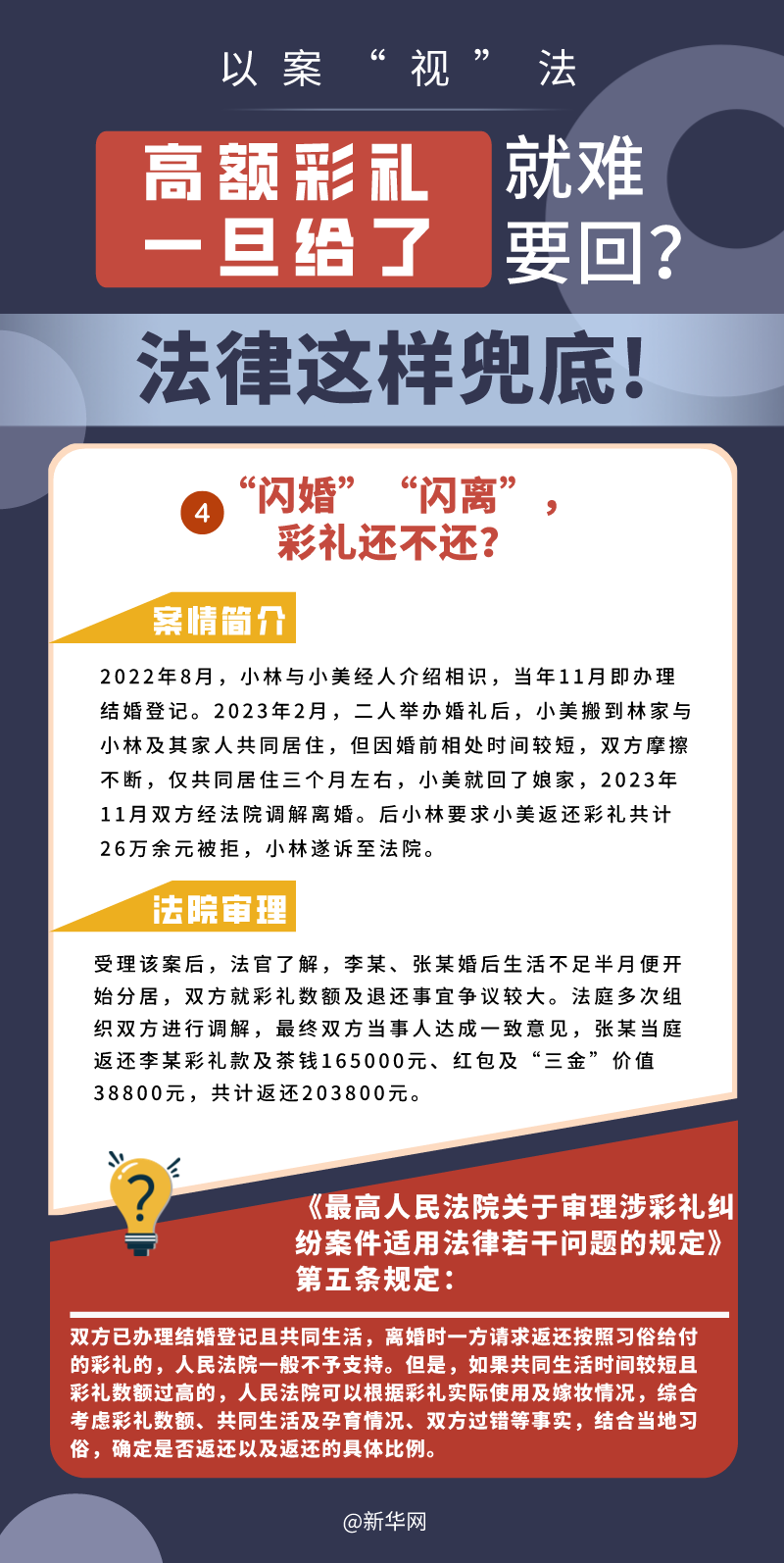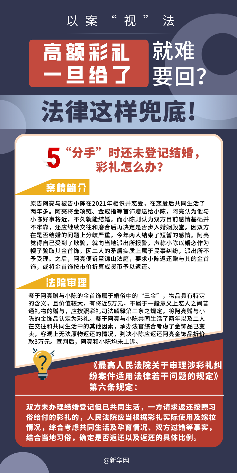 “五一”長(zhǎng)假期間,各地迎來(lái)了婚禮高峰期,“彩禮”話(huà)題,尤其農(nóng)村高額彩禮現(xiàn)象備受關(guān)注。破解高價(jià)彩禮,在解決爭(zhēng)議的層面,司法盡了最大努力兜底。本期《以案“視”法》針對(duì)涉“高額彩禮”糾紛,帶大家學(xué)習(xí)相關(guān)法律知識(shí)。