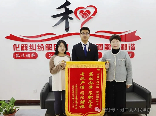“感謝調(diào)解員為我們排憂解難,提供高效便捷的司法服務(wù),本來以為訴訟時(shí)間會(huì)很長,沒想到這么快就處理好了,今后我們一定努力提高服務(wù)水平。”近日,某物業(yè)公司將一面寫有“高效辦案盡職盡責(zé) 專業(yè)嚴(yán)謹(jǐn)司法楷?!钡腻\旗送至河曲法院訴前調(diào)解中心,對(duì)法院溫馨的訴訟服務(wù)和特邀調(diào)解員優(yōu)質(zhì)高效的調(diào)解表示感謝!