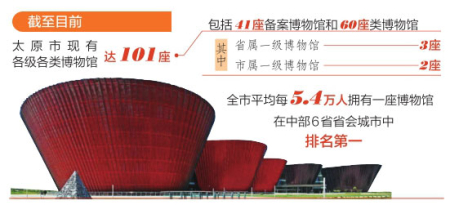太原市充分發(fā)揮文物資源優(yōu)勢(shì),將博物館作為文物保護(hù)利用改革的突破口,傾力建設(shè)凸顯地方文化特色的“博物館之城”。截至目前,太原市現(xiàn)有各級(jí)各類(lèi)博物館達(dá)101座,包括41座備案博物館和60座類(lèi)博物館,其中省屬一級(jí)博物館3座、市屬一級(jí)博物館2座。全市平均每5.4萬(wàn)人擁有一座博物館,在中部6省省會(huì)城市中排名第一,遠(yuǎn)超全國(guó)平均水平。