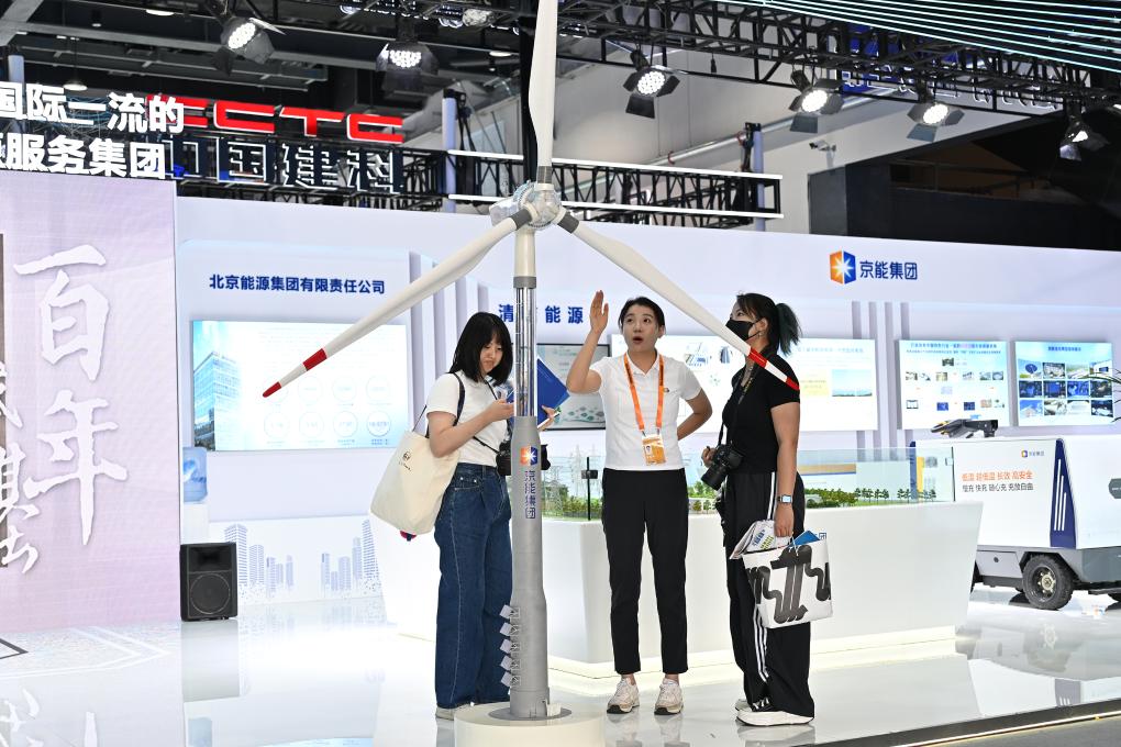 參觀者在服貿(mào)會首鋼園區(qū)京能集團(tuán)展臺觀看一款新型風(fēng)機(jī)模型。新華社記者 李鑫 攝