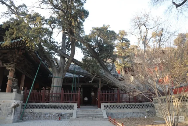 三千年晉祠的“見證者”——周柏。周柏長于圣母殿右側(cè),18米長的周柏向南傾斜生長,被另一株古柏所支撐,樹葉披覆在圣母殿頂,樹干粗壯,得幾人才能合抱,像一條橫臥的巨龍,因此有“臥龍柏”之美譽。經(jīng)科學(xué)測定,此樹已有二千九百九十多歲。在晉祠,樹齡在千年以上的蒼松、翠柏、古槐等尚存二十余株,它們和古柏一起見證著晉祠的悠悠歷史。