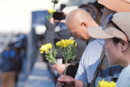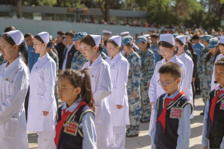 圖③、圖④:9月18日,在哈爾濱市的侵華日軍第七三一部隊罪證陳列館外,人們在防空警報鳴響時肅立默哀。