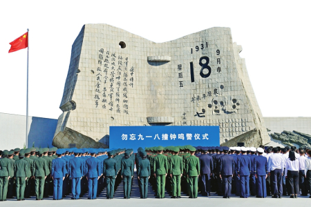 圖①:9月18日,在沈陽“九·一八”歷史博物館殘歷碑廣場拍攝的“勿忘九一八”撞鐘鳴警儀式現(xiàn)場。